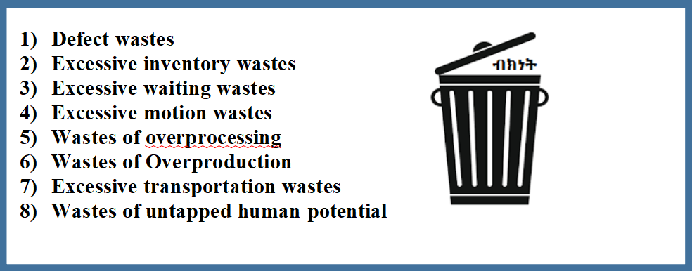 Defects waste occurs due to production of a product or provision of a service not according to the customers demand or required specification and the product or the service is considered to be a waste which further increases the cost of products or services. In Ethiopia, my experience tells me that this category of waste constitute the large portion of all categories of wastes.